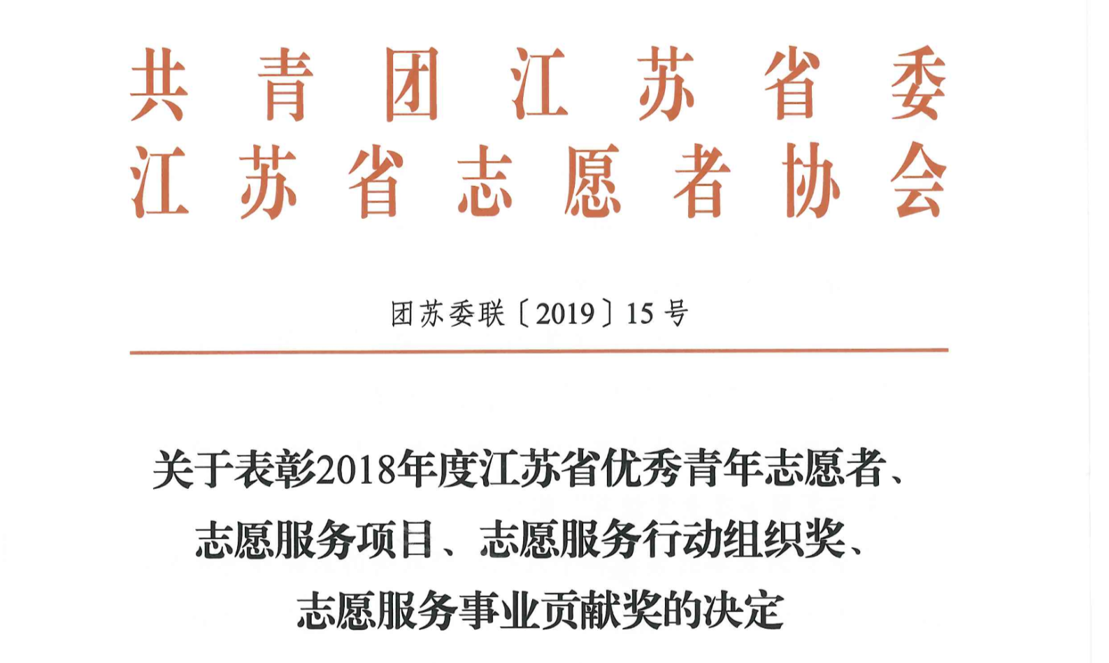 荣获“2018年度江苏省青年志愿服务行动组织奖”称号。