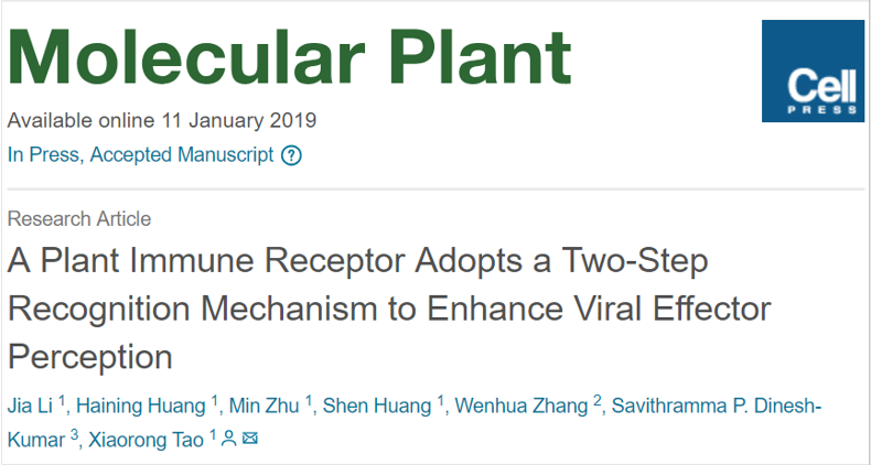 植物病毒学研究团队的最新研究揭示了植物免疫受体蛋白对病原菌一种新的识别机制,研究发现在植物免疫系统监测病毒入侵时,植物免疫受体蛋白Sw-5b通过两步识别机制监测病毒入侵,第一步特异性识别病毒,打开一层开关,第二步再特异性识别病毒,进一步打开一层开关,通过双重保障,精确打开免疫受体这个分子开关,进而发动对病毒的国防战争,研究还发现两步识别机制能显著增强植物免疫系统对病毒入侵的监测能力,该研究成果于近日发表在国际知名学术期刊《分子植物》(Molecular Plant,IF: 9.326)。