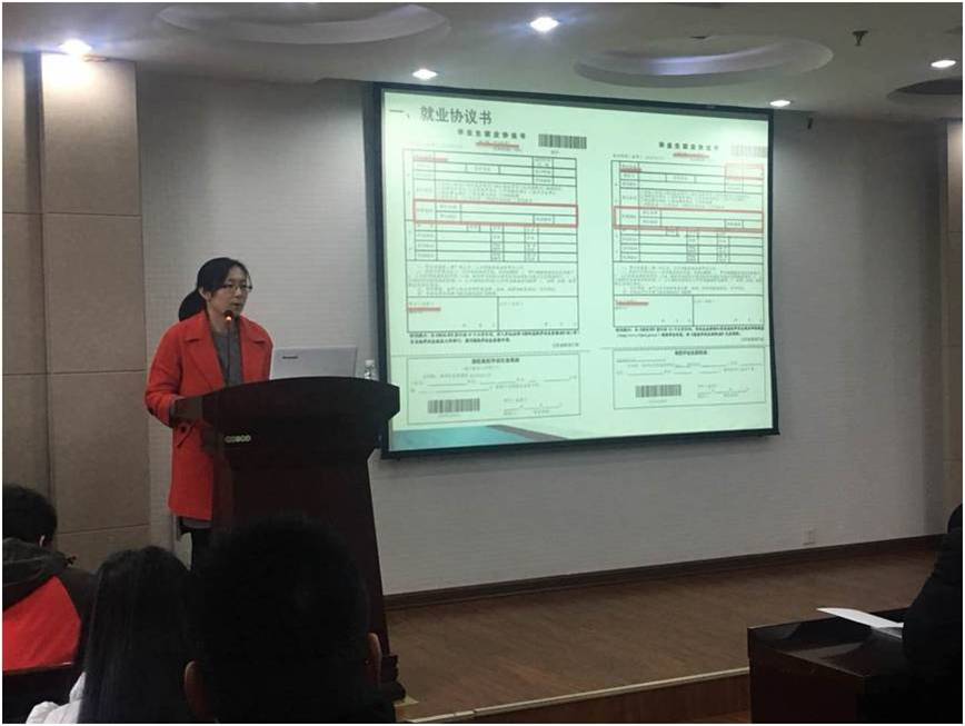 会议伊始,岳老师为大家讲解有关毕业答辩方面的情况,包括毕业答辩流程、注意事项、申请授予研究生学位证需要满足哪些条件等;接着吴老师为大家讲解了离校方面的事情,内容涉及到毕业生就业协议、报到证、离校存查表、档案、户口等。吴老师还针对2014-2016届毕业生的调查问卷结果分析毕业生毕业期望及就业形势等相关内容。老师讲解之后还进行了疑问解答,即现场的毕业生对毕业、择业等尚不清楚的问题当面向两位老师询问,岳老师与吴老师也对各位毕业生的问题细心的一一作答,使大家都明白了各自心中的疑惑。