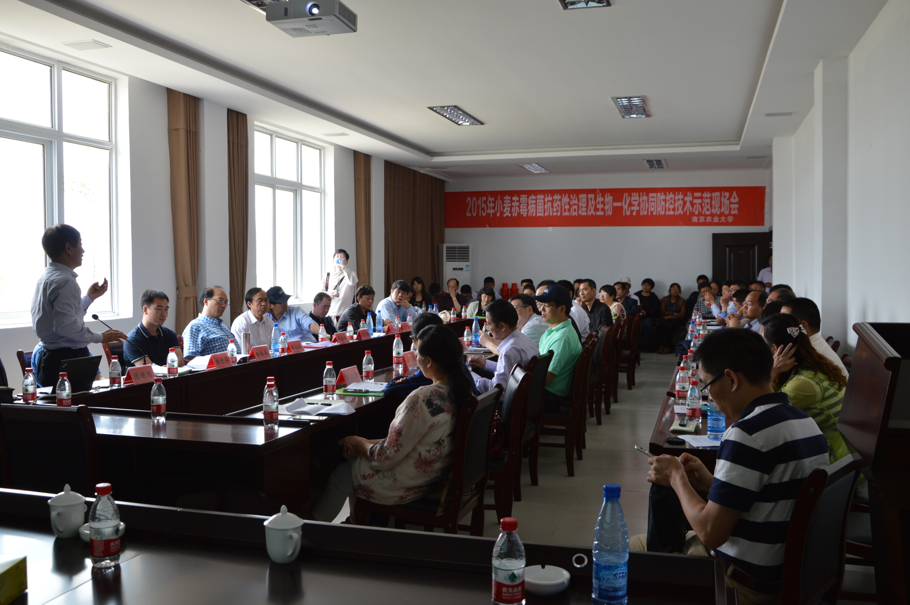 现场观摩后,在白马湖农场会议室并召开小麦赤霉病菌抗药性治理及生物-化学协同防控技术示范现场观摩研讨会,与会专家和领导显得比较兴奋,更是踊跃发言。他们首先对周教授团队的严谨试验高度肯定,同时发表了他们的宝贵意见,以期促进优势药剂尽早产业化。