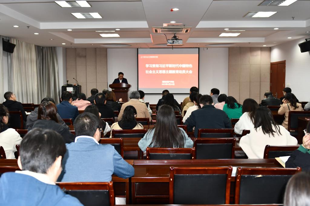 会上,学院党委书记邵刚传达了学校党委学习贯彻习近平新时代中国特色社会主义思想主题教育动员大会精神,指出要紧紧围绕“学思想、强党性、重实践、建新功”的总要求,一体推进理论学习、调查研究、推动发展、检视整改,做好建章立制工作,切实增强主题教育的针对性、实效性。他立足学院实际,就有效开展主题教育做具体工作部署,强调要坚持学思用贯通、知信行统一,以具体目标为牵引、以解决问题为抓手,围绕学科建设、队伍建设、人才培养、社会服务和国际合作等方面,以深化调查研究推动解决发展难题、以师生满意作为办事成效的标尺,切实把学习成果转化为推动学院高质量发展的动力。