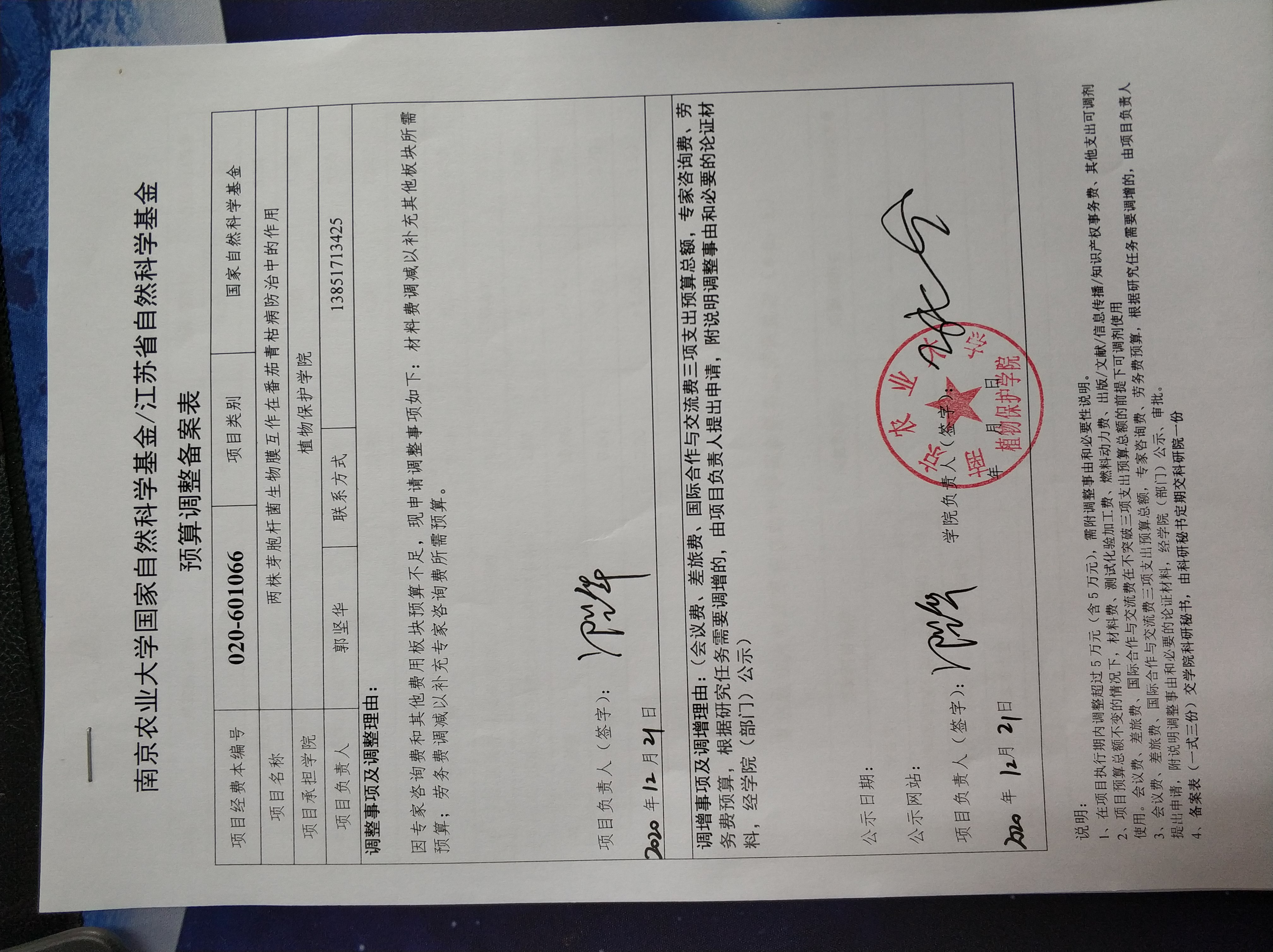 国家自然科学基金“两株芽胞杆菌生物膜互作在番茄青枯病防治中的作用”预算调整